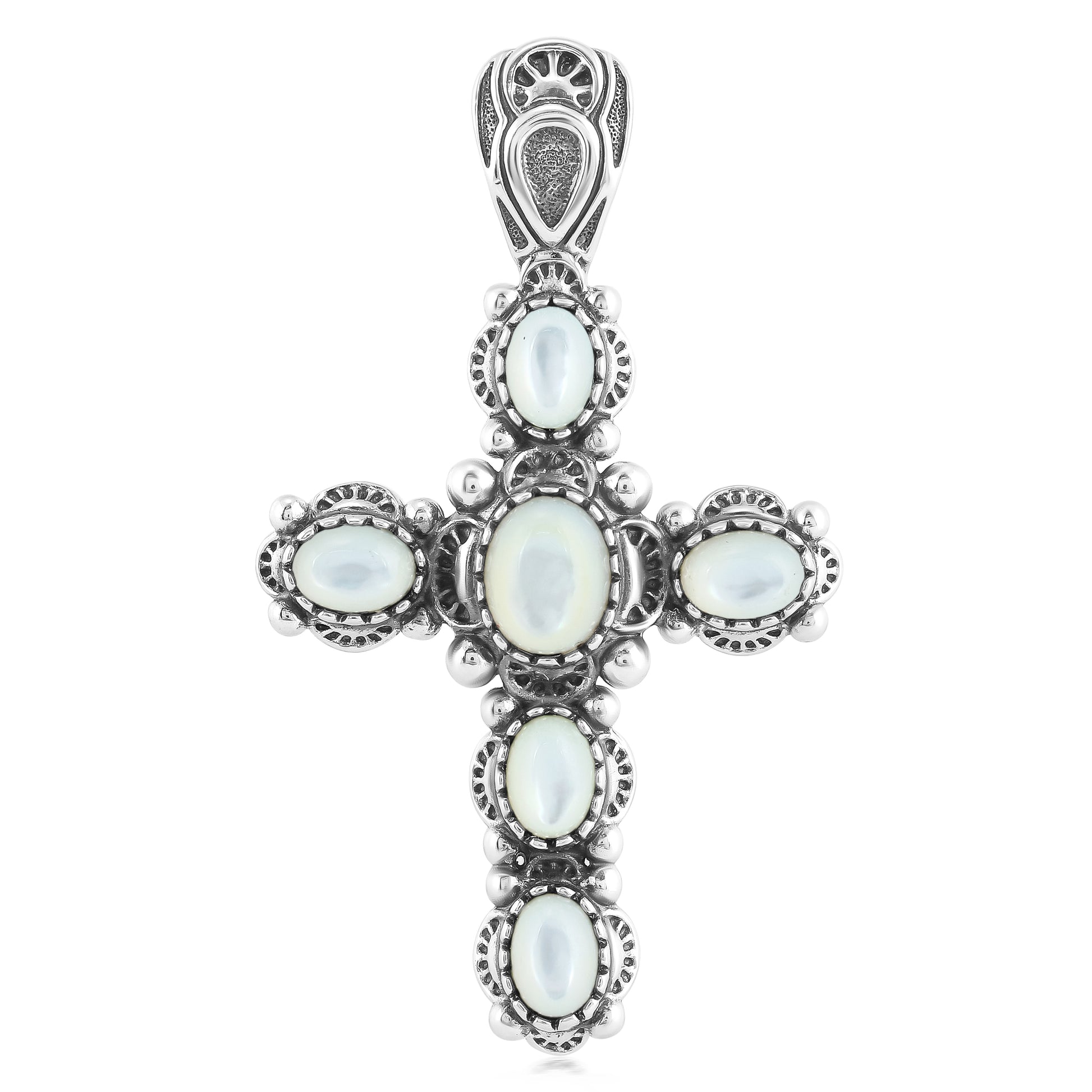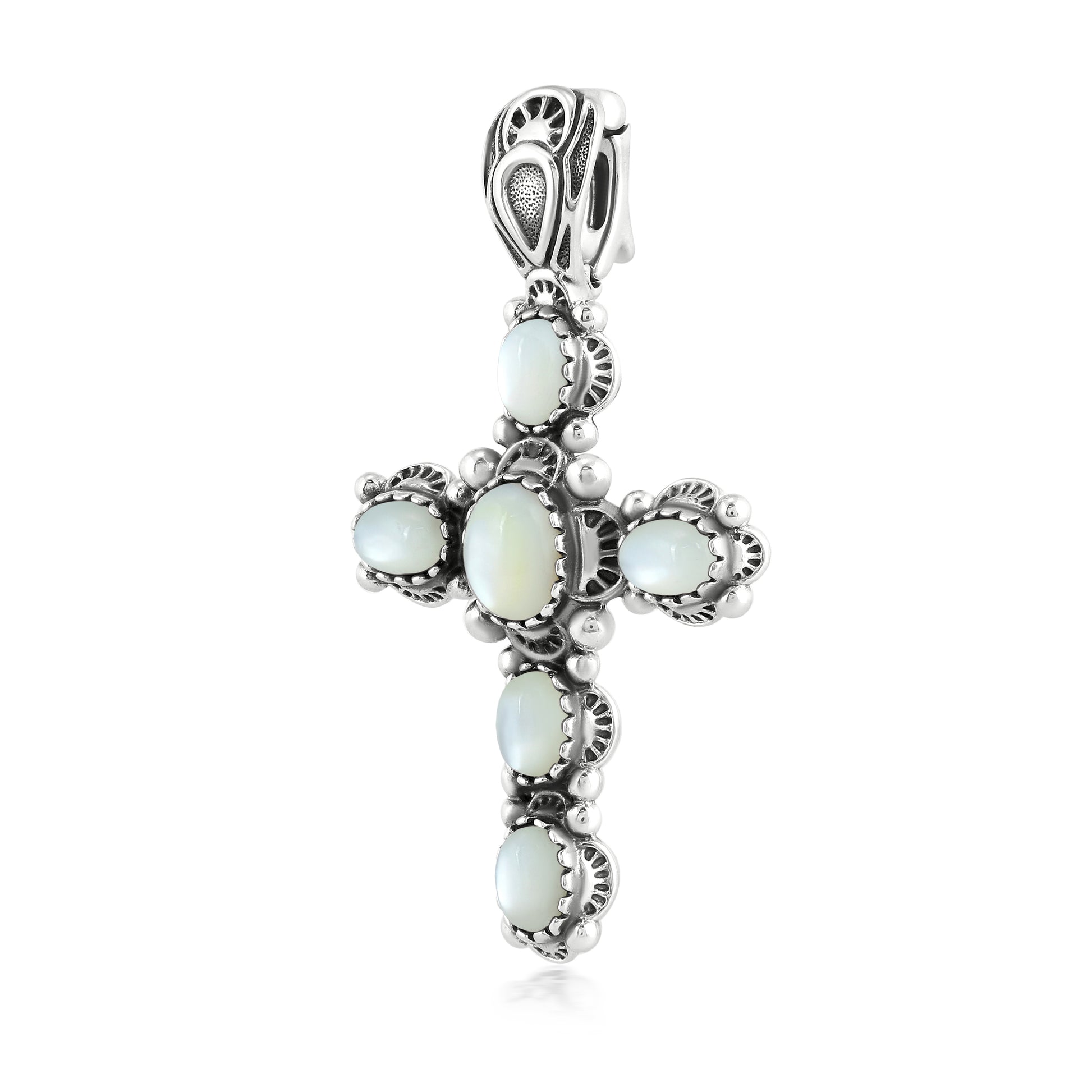 • Cross pendant features center 7x9mm White Mother of Pearl cabochon with (5) additional 7x5mm gemstones, bezel-set with silver beads and concha motifs