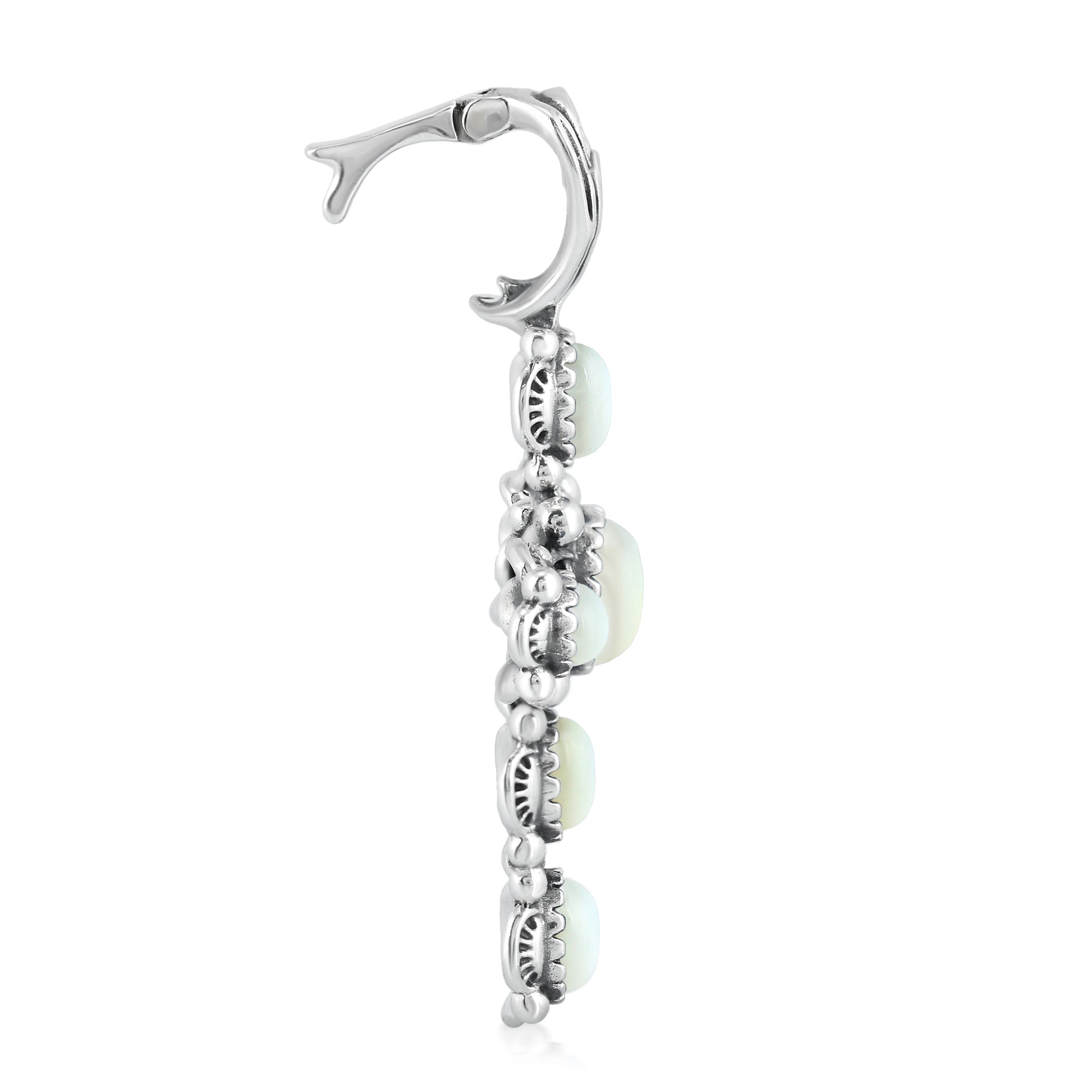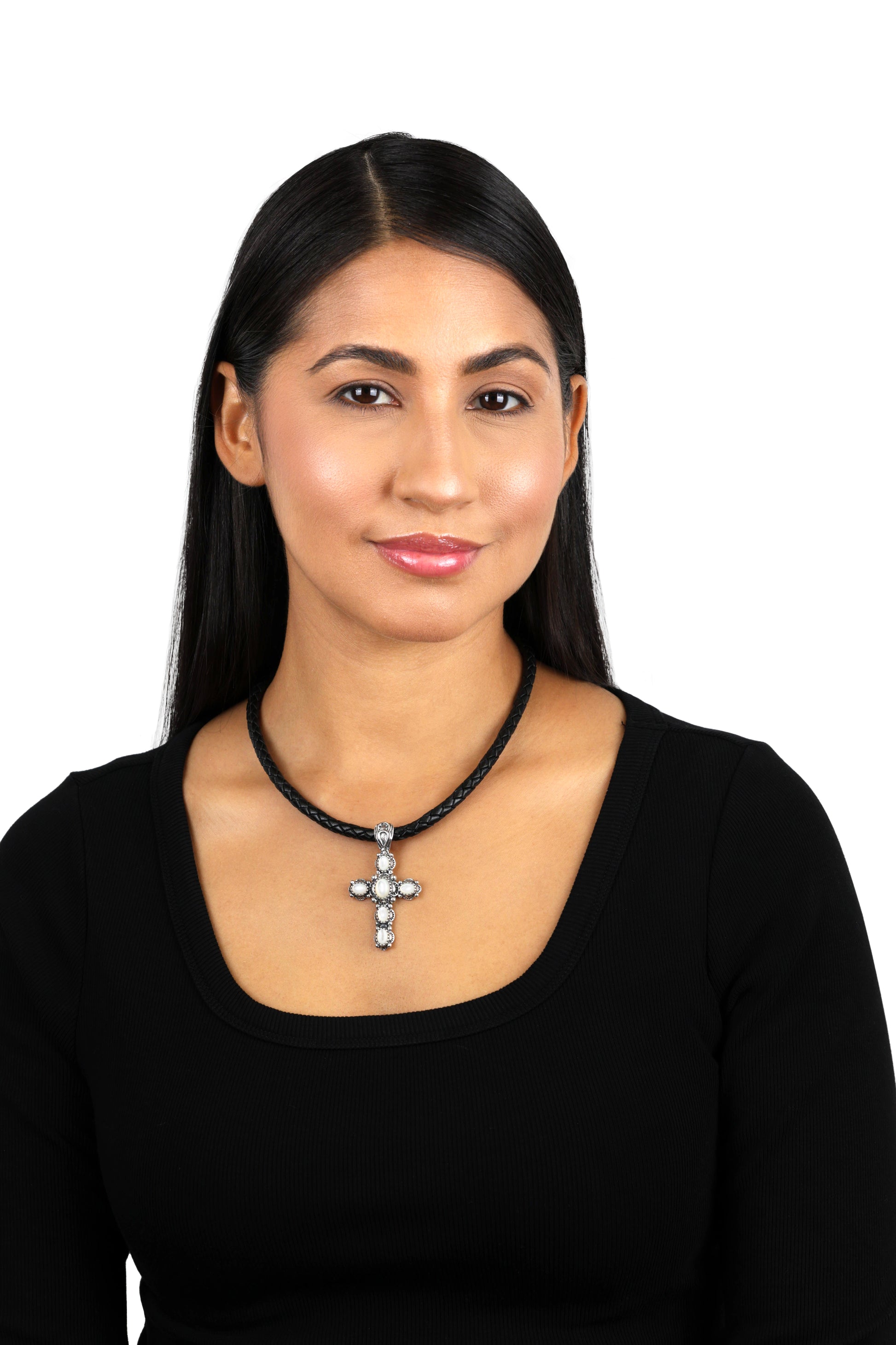 Add a splash of chic to any look with this versatile, Southwest-inspired Cross Pendant made of 925 Sterling Silver and gemstones. This classic Cross features 6 oval gemstones of White Mother of Pearl in graduated sizes that are set in serrated bezel mounts with a concha a motif. All with a polished oxidized finish. Mother of Pearl gemstones promote understanding, intuition, creativity and protection.