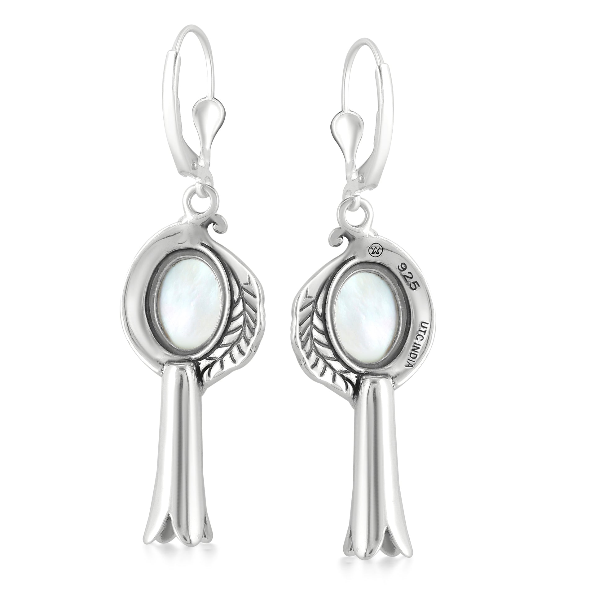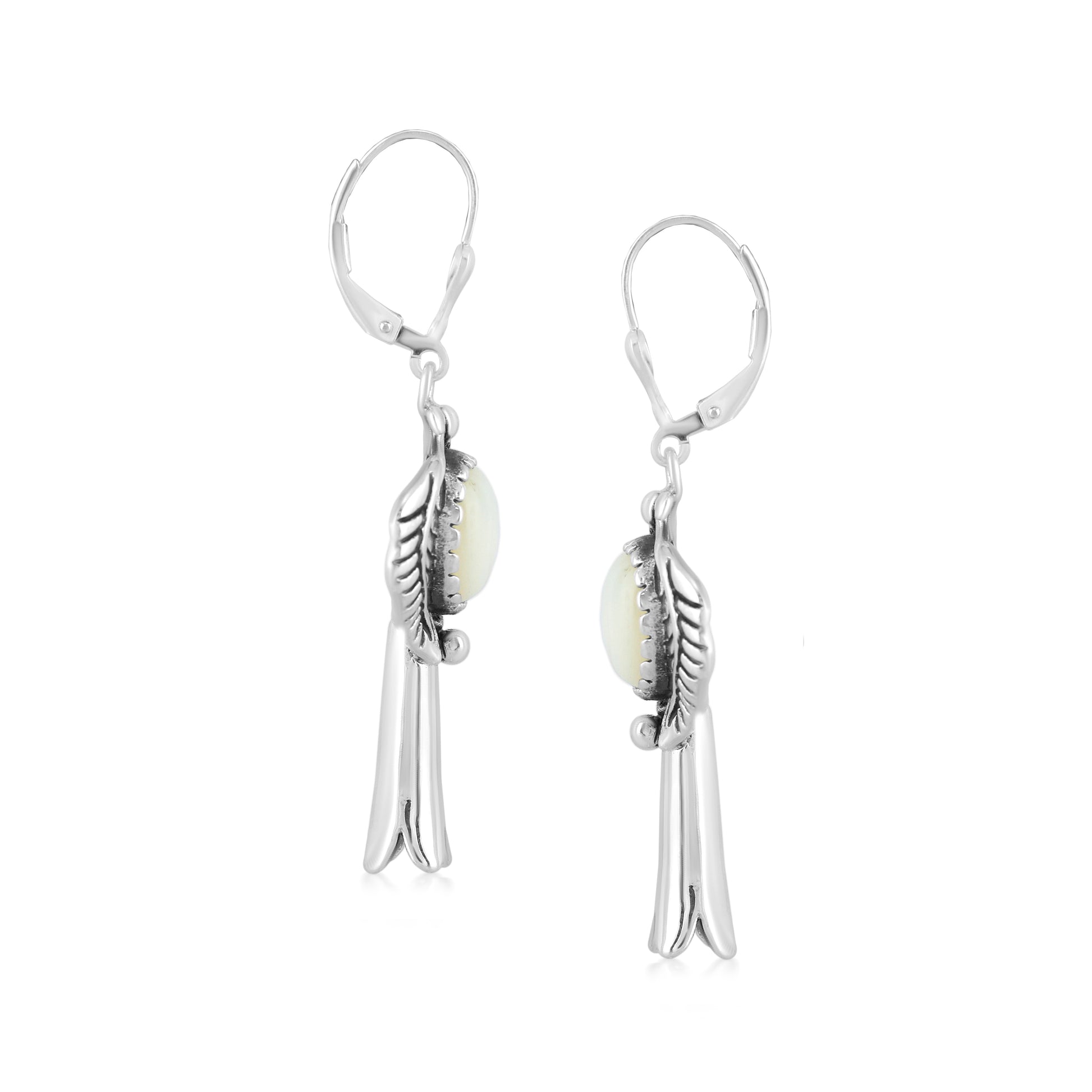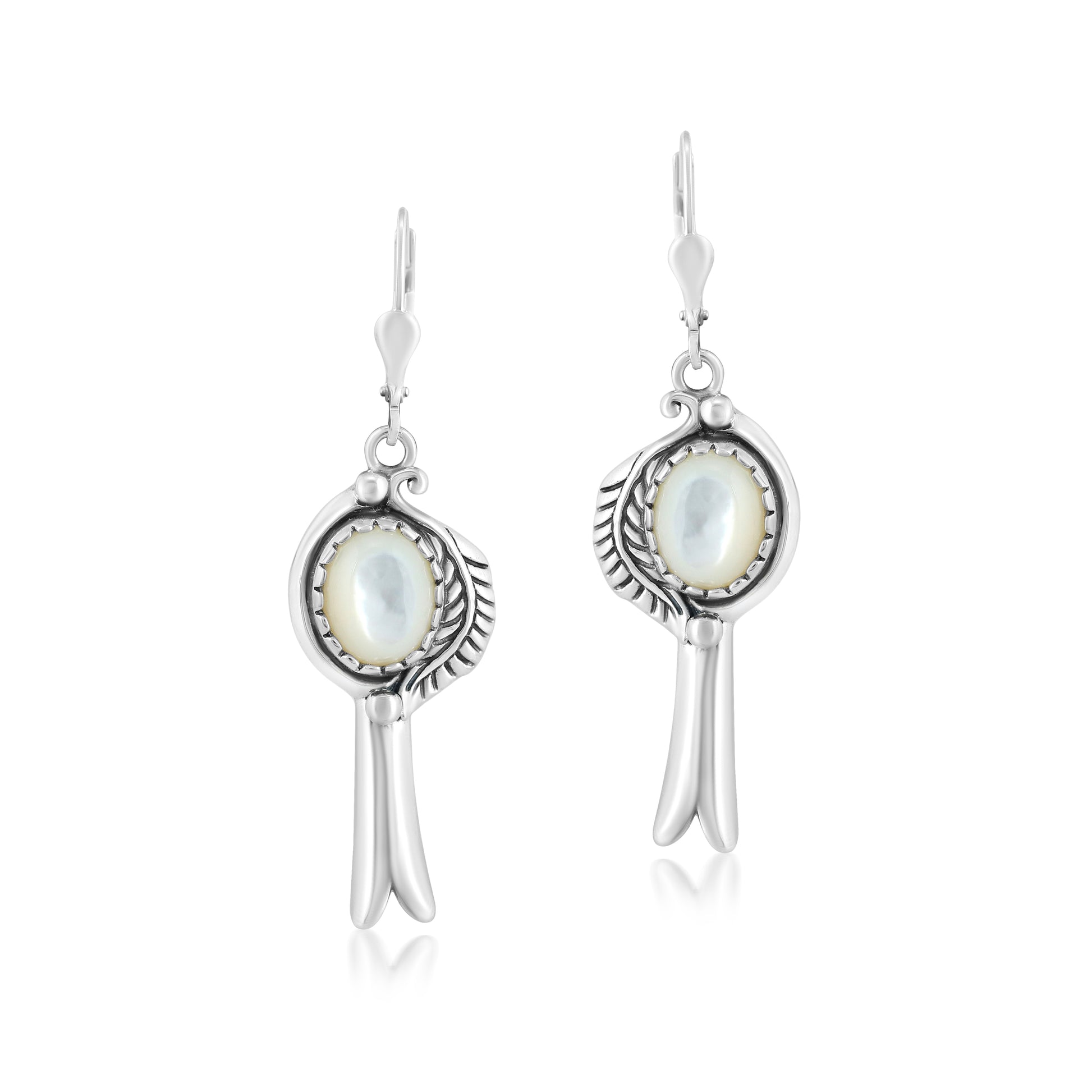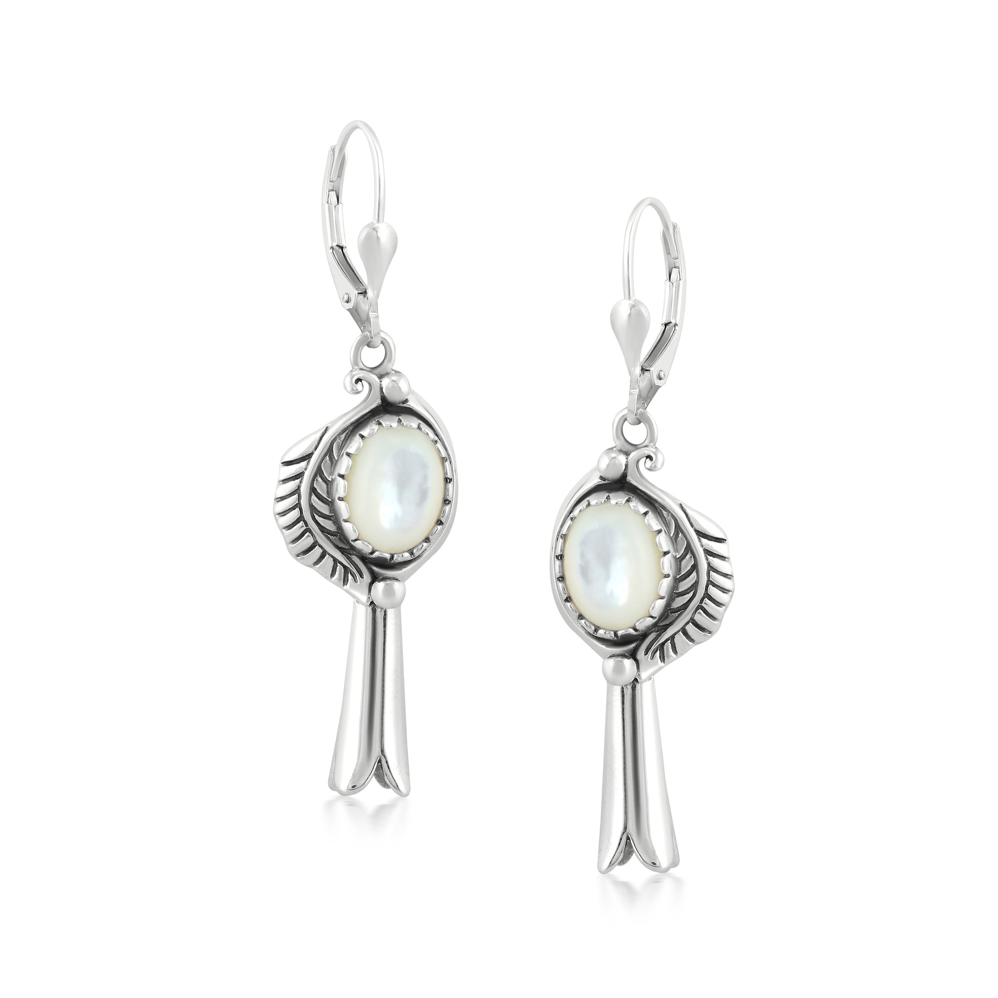 - Dangle earrings feature an oval White Mother of Pearl gemstone cabochon set in a serrated oval bezel surrounded by a leaf design with a squash blossom dangling below.