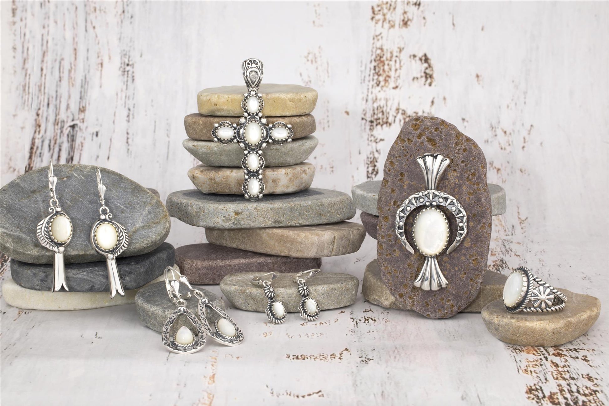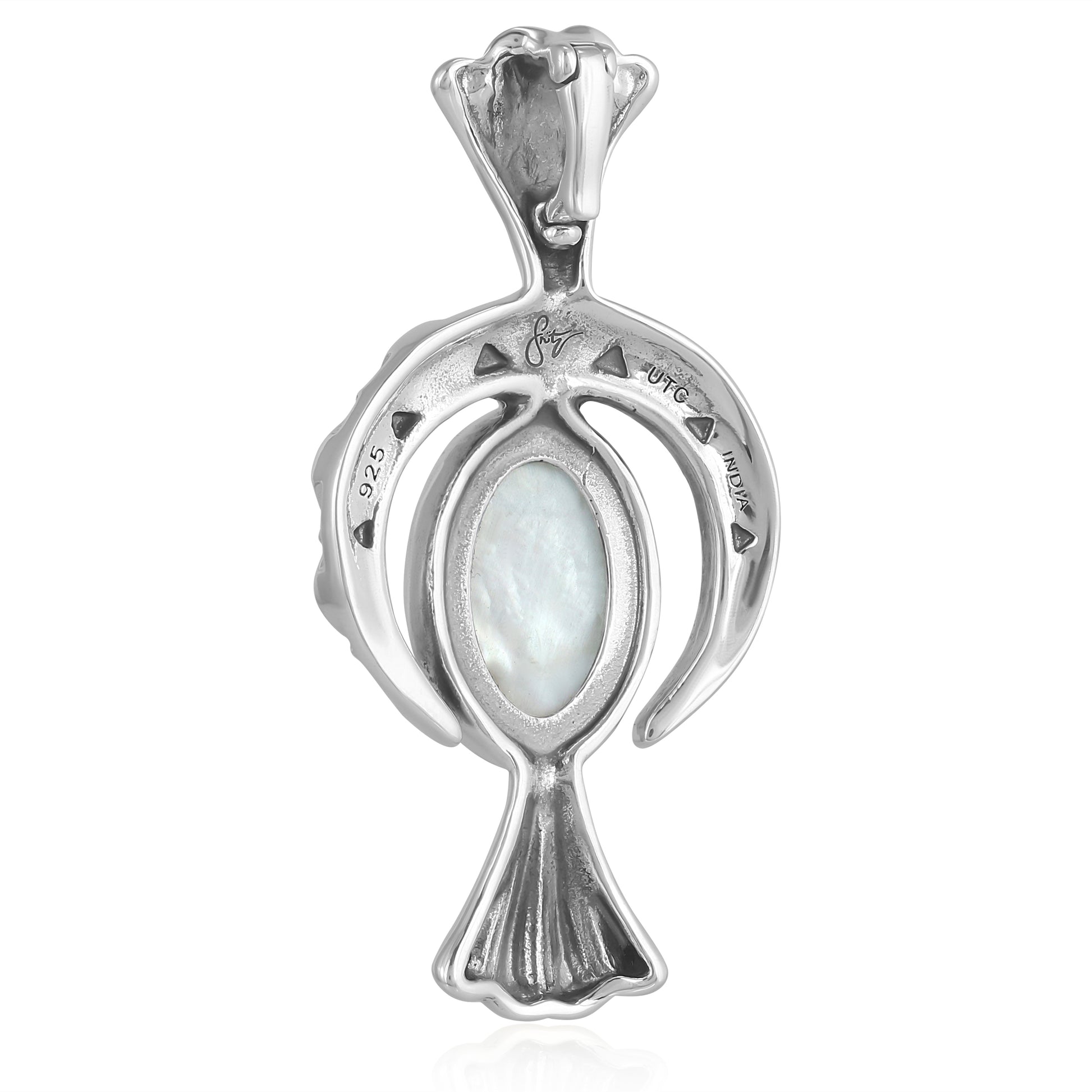 Fritz Casuse is an award-winning Navajo jewelry artist known for his innovative, sculptural designs that combine traditional Native American elements with modern aesthetics. His intricate pieces often feature dynamic shapes and textures, showcasing Sterling Silver and genuine gemstones to create bold, storytelling jewelry. This naturally colorful Southwestern Sterling Silver Pendant Enhancer features a naja crescent moon shape design adorned with an oval-shaped White Mother of Pearl gemstone in the center and a silver squash blossom below. This exclusive pendant measures 1 inch wide by 2 inches long. A hidden snap hinge bail on the back is easy to operate. Mother of Pearl is known to absorb negative energy, clarify feelings and stabilize emotions and is the June birthstone.