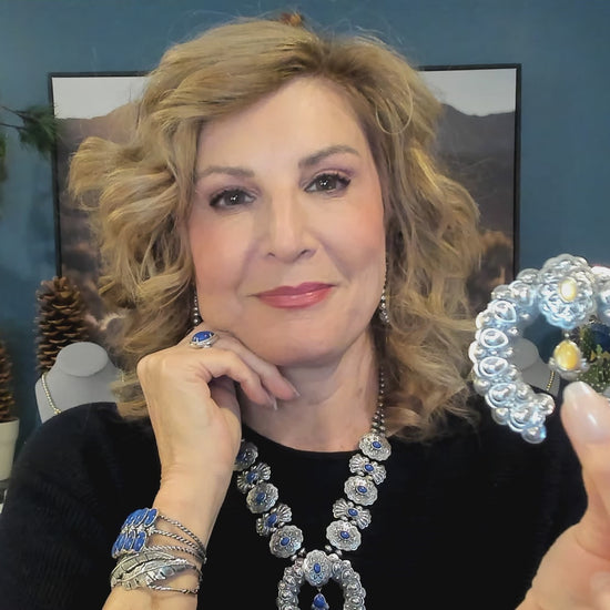 Complete your look today with this beautiful pendant enhancer inspired by Southwest traditions and designs. A beaded silver border, pear shaped silver "pearl" beads, and stunning oxidized details make this a go-to piece for your favorite cord, chain or beaded necklace. It features 2 Yellow Mother of Pearl gemstones at the top - one oval shape bezel set with sun design accents and one dangling pear shaped gemstone with fan accents. The hinged bail can accommodate most necklaces or cords. This piece captures the lifestyle and rich history of New Mexico in genuine .925 reclaimed Sterling Silver, always nickel-free. You'll feel unique and confident the moment you put it on. Our jewelry is the perfect way indulge your wife, significant other, best friend and even yourself! Packaged in a signature gift box, it is perfect for birthdays, anniversaries or holiday celebrations. This original piece was designed in Albuquerque, New Mexico, USA. Buy with Confidence – If oxidation or tarnish darkens the piece over time, use a polishing cloth to restore to desired finish.