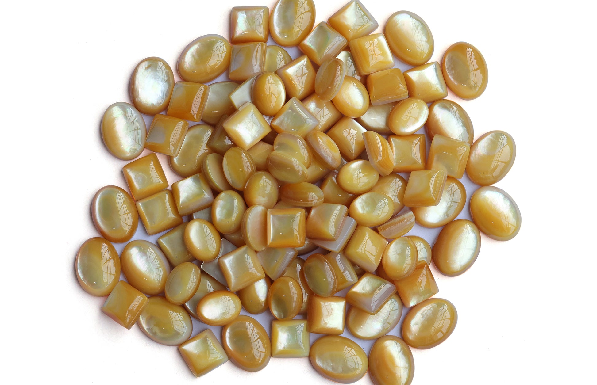 • Cross pendant features center 7x9mm Yellow Mother of Pearl cabochon with (5) additional 7x5mm gemstones, bezel-set with silver beads and concha motifs