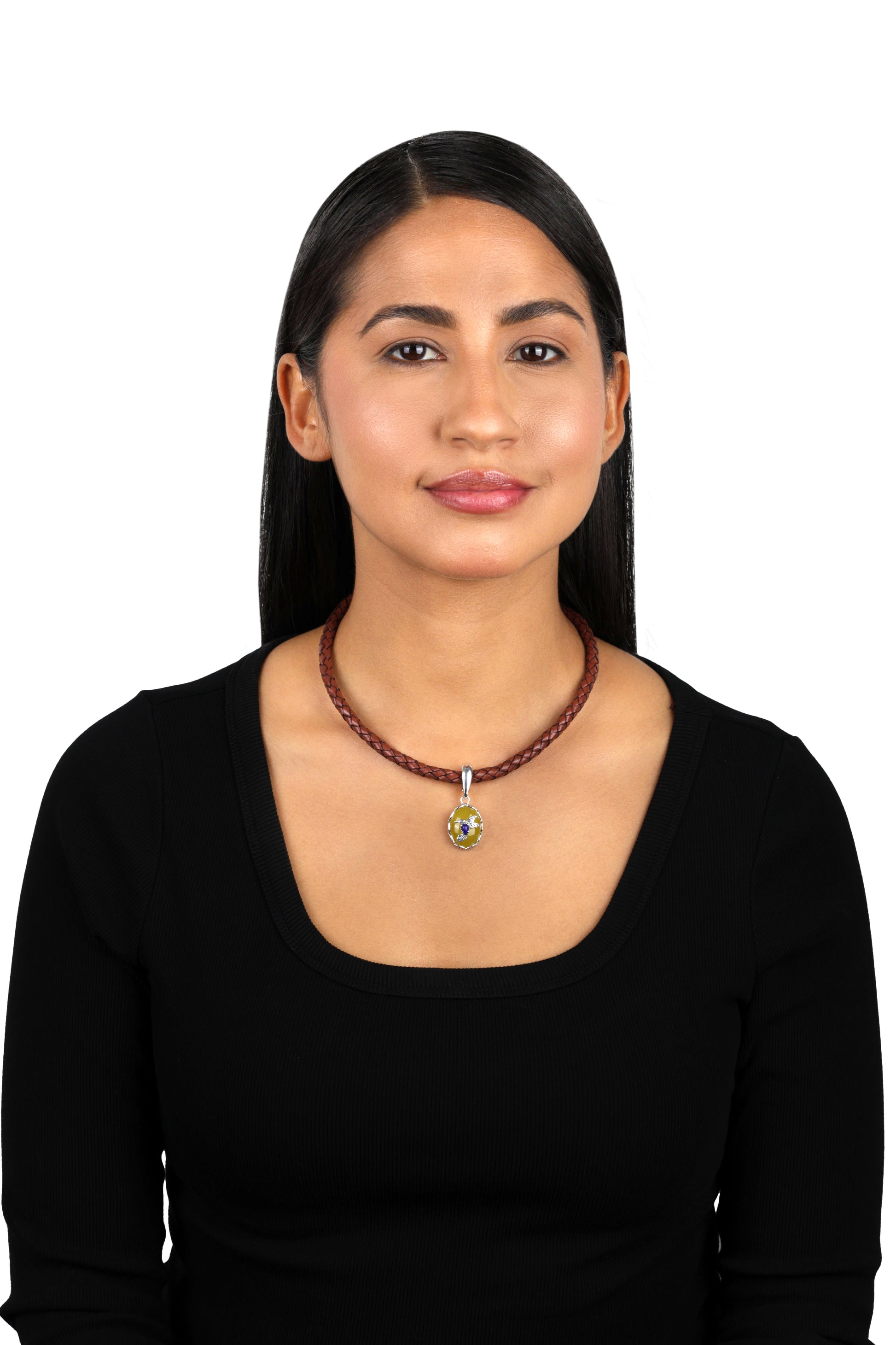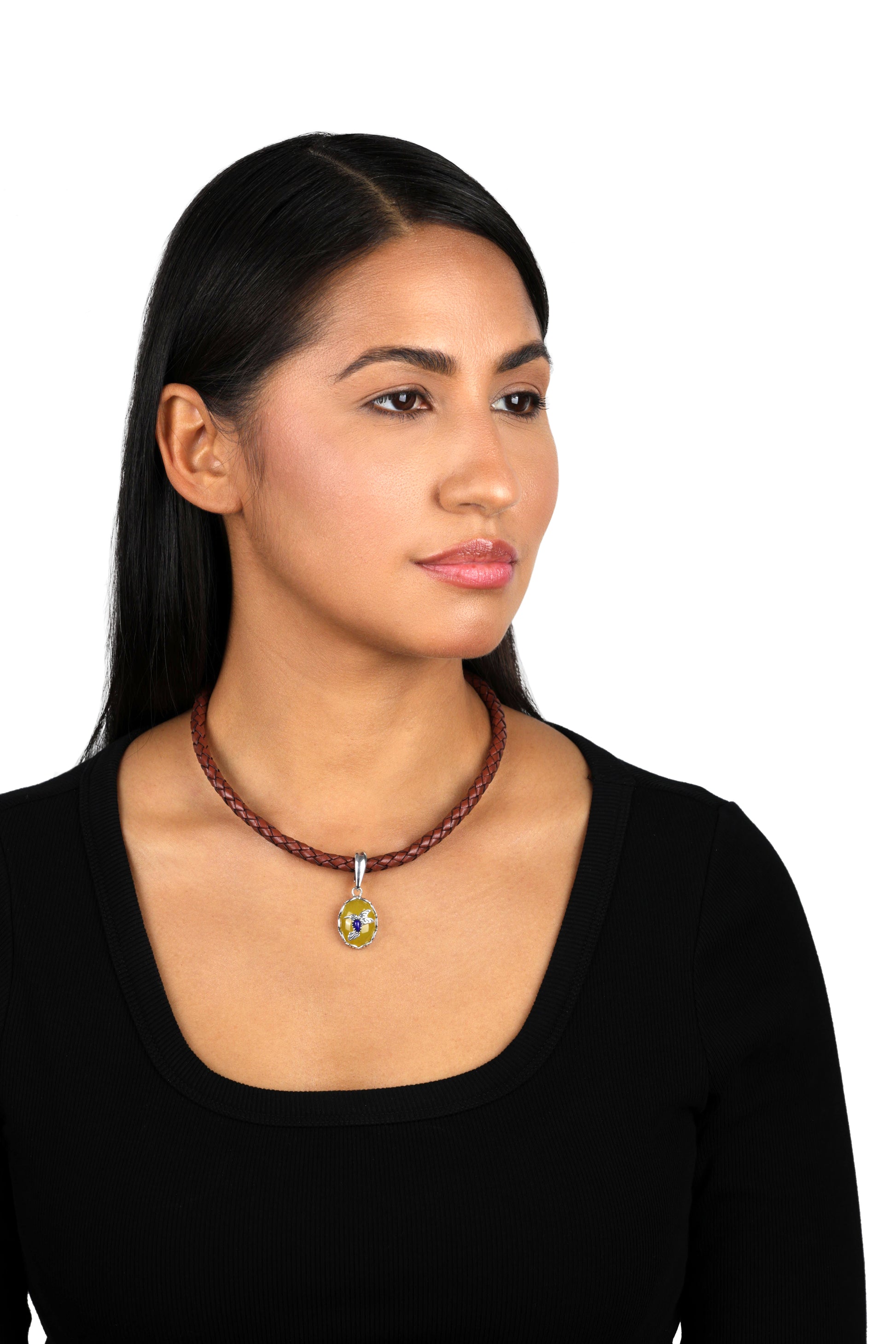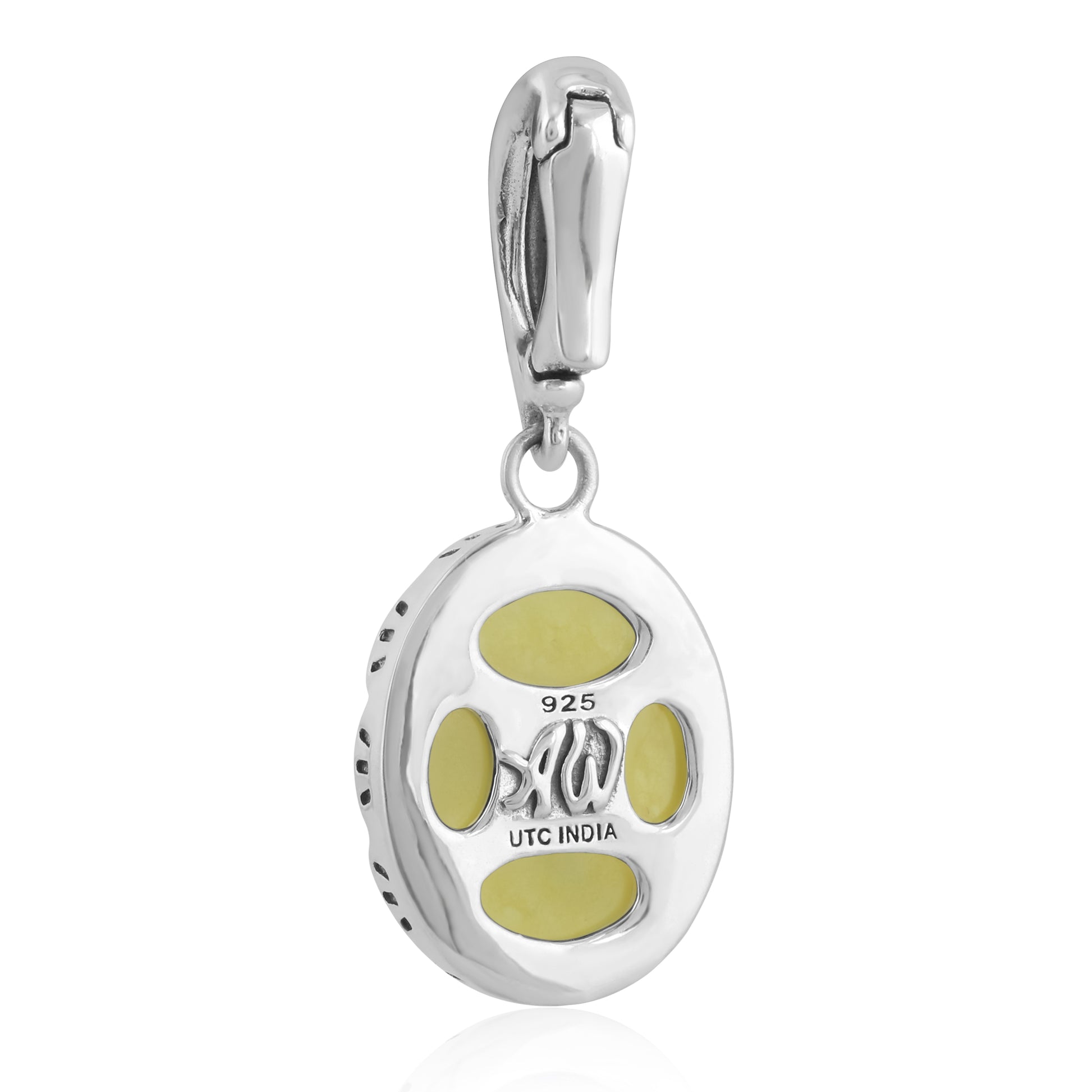 This naturally colorful Southwestern Sterling Silver Hummingbird Pendant Enhancer features an oval-shaped 15x20mm Yellow Quartz set in a scalloped sun ray bezel-setting. A Silver hummingbird adorns the center with a pear-shaped 3x5mm blue Lapis gemstone. A snap hinged bail accommodates most chains, necklaces, and cords. This pendant enhancer measures .6" wide by 1.75" long, including the bail. This beautiful pendant is part of our Spirit Stone Collection, which features a delightful array of animal-inspired pieces that embody the power of the wild through genuine, hand-carved gemstones. Yellow Quartz is a vibrant and radiant variety of Quartz prized for its golden-yellow to amber hues. Its warm and sunny color gives it a bright, cheerful appearance, often evoking feelings of optimism, happiness, and warmth. Every gemstone in the world is naturally unique, just like you! We carefully select the GIA certified gems for each piece, making your pendant one-of-a-kind. You will find that this pendant enhancer will elevate any outfit! Whether at work, a date night with your honey or a special party or event– American West Jewelry will get you noticed. Get ready for compliments!