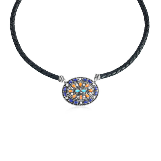 Sterling Silver Multi-Gemstone Oval Pendant Black Leather Necklace, 17 to 20 Inches