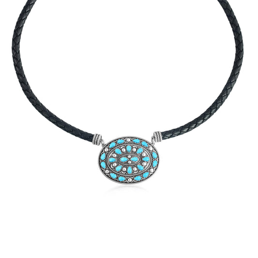 Sterling Silver Kingman Turquoise Oval Pendant Black Leather Necklace, 17 to 20 Inches